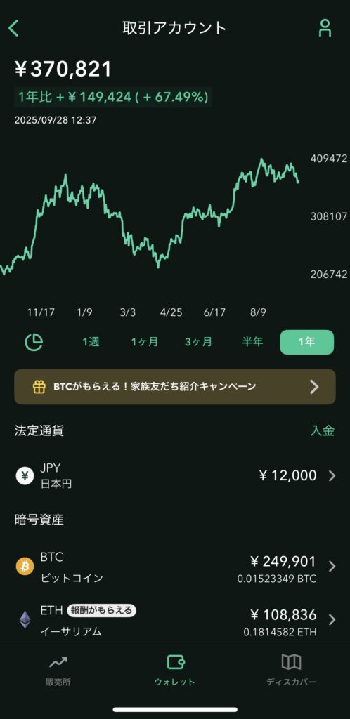 元本は15万円です。(アカウント内の日本円含む)ビットコインとイーサリアムを保有しています。